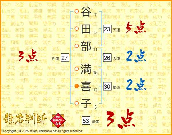 谷(7画)田(5画)部(11画) 満(15画)喜(12画)子(3画)