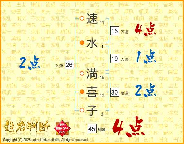 速(11画)水(4画) 満(15画)喜(12画)子(3画)