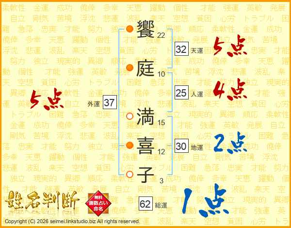 饗(22画)庭(10画) 満(15画)喜(12画)子(3画)
