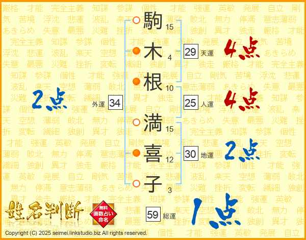 駒(15画)木(4画)根(10画) 満(15画)喜(12画)子(3画)