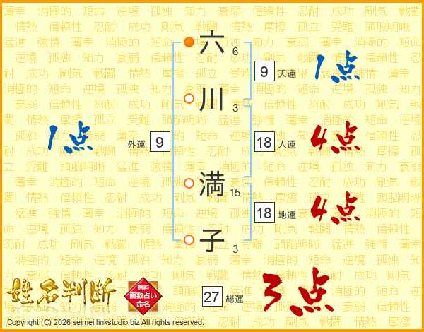 あなたの人生を表す1番重要な運勢です。生涯を通じて影響する総合運となり、主に50歳以降の晩年期に影響を及ぼします。苗字と名前の合計画数。