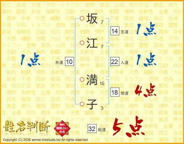 生活面を象徴する運勢です。外部から受ける影響力を表し、結婚運、家庭運や職場、環境への順応性を表します。総運から人運を引いた画数。姓や名が1文字の場合を除く。