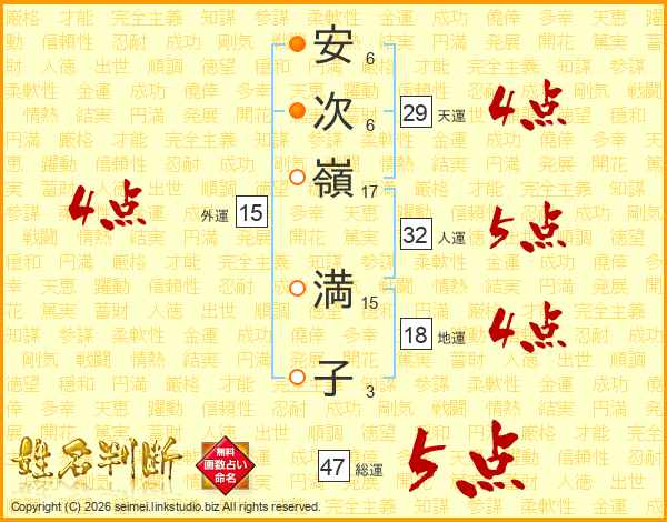 安(6画)次(6画)嶺(17画) 満(15画)子(3画)
