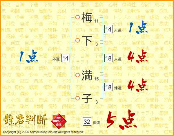生活面を象徴する運勢です。外部から受ける影響力を表し、結婚運、家庭運や職場、環境への順応性を表します。総運から人運を引いた画数。姓や名が1文字の場合を除く。