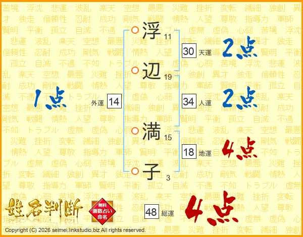 浮(11画)辺(19画) 満(15画)子(3画)