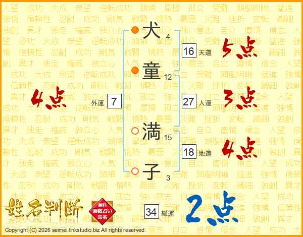 犬(4画)童(12画) 満(15画)子(3画)