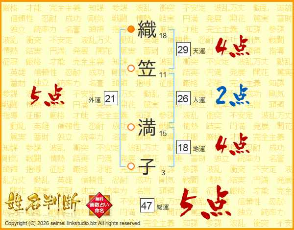 あなたの人生を表す1番重要な運勢です。生涯を通じて影響する総合運となり、主に50歳以降の晩年期に影響を及ぼします。苗字と名前の合計画数。