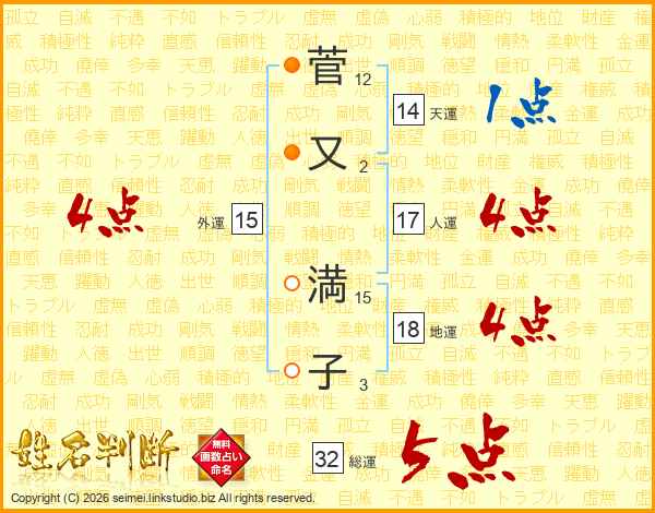 あなたの人生を表す1番重要な運勢です。生涯を通じて影響する総合運となり、主に50歳以降の晩年期に影響を及ぼします。苗字と名前の合計画数。