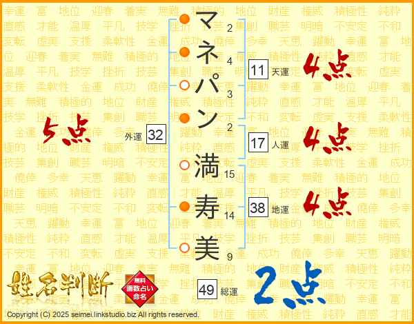 マ(2画)ネ(4画)パ(3画)ン(2画) 満(15画)寿(14画)美(9画)