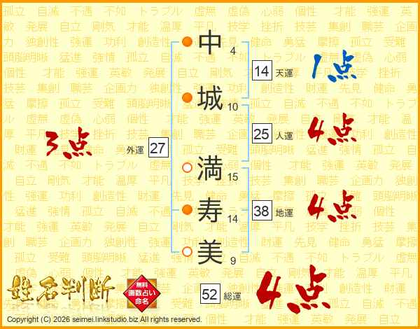 中(4画)城(10画) 満(15画)寿(14画)美(9画)