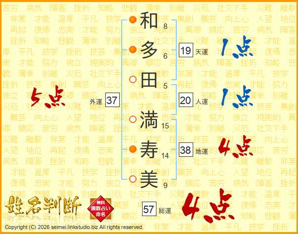 和(8画)多(6画)田(5画) 満(15画)寿(14画)美(9画)