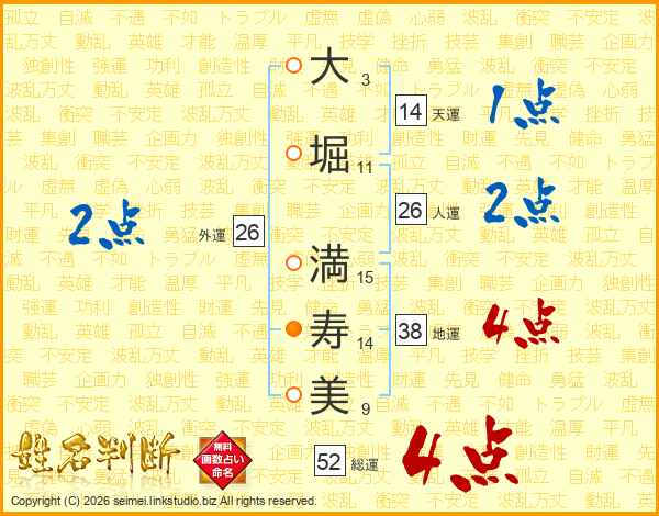 大(3画)堀(11画) 満(15画)寿(14画)美(9画)
