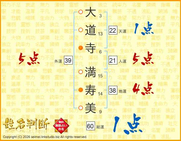 大(3画)道(13画)寺(6画) 満(15画)寿(14画)美(9画)