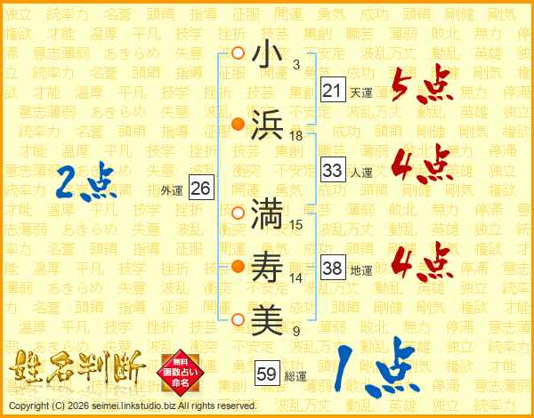 小(3画)浜(18画) 満(15画)寿(14画)美(9画)