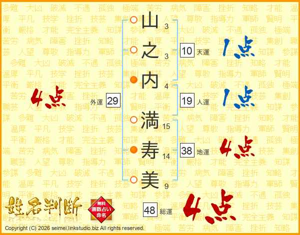 山(3画)之(3画)内(4画) 満(15画)寿(14画)美(9画)
