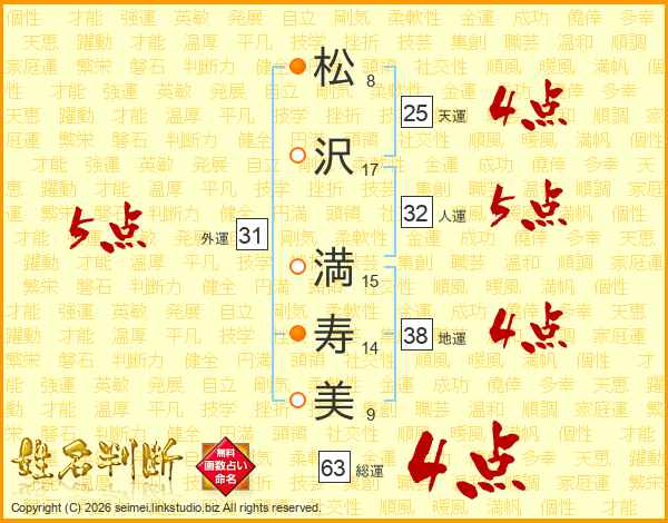 松(8画)沢(17画) 満(15画)寿(14画)美(9画)