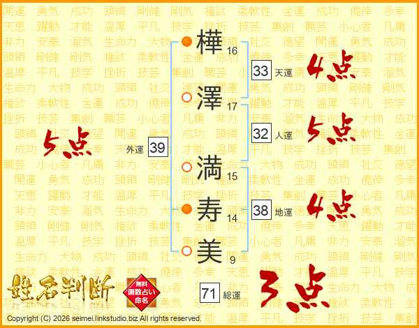 樺(16画)澤(17画) 満(15画)寿(14画)美(9画)