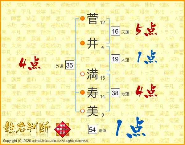菅(12画)井(4画) 満(15画)寿(14画)美(9画)