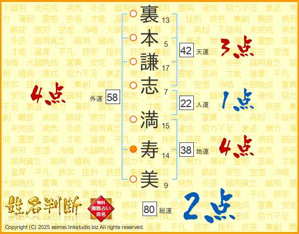 裏(13画)本(5画)謙(17画)志(7画) 満(15画)寿(14画)美(9画)