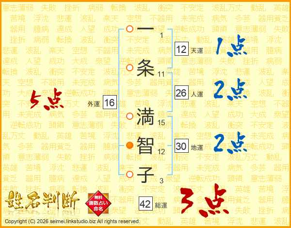 一(1画)条(11画) 満(15画)智(12画)子(3画)
