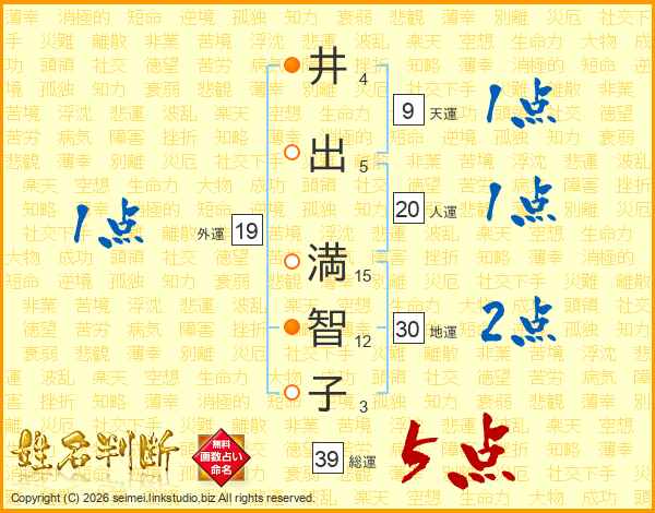 井(4画)出(5画) 満(15画)智(12画)子(3画)