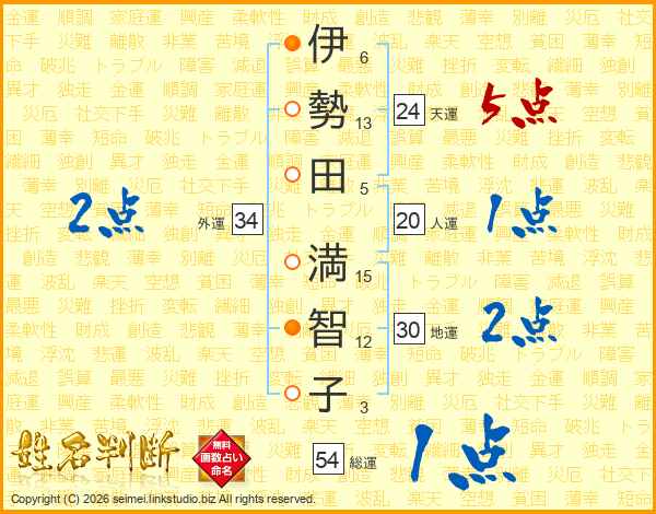 伊(6画)勢(13画)田(5画) 満(15画)智(12画)子(3画)