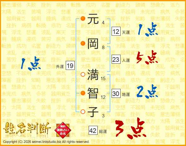 元(4画)岡(8画) 満(15画)智(12画)子(3画)