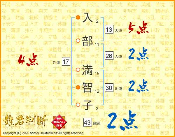入(2画)部(11画) 満(15画)智(12画)子(3画)
