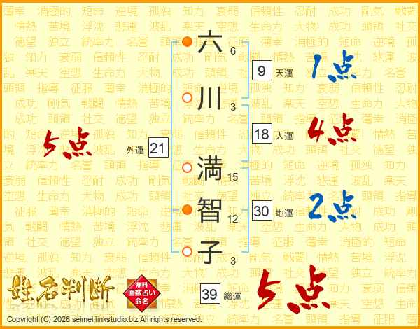 六(6画)川(3画) 満(15画)智(12画)子(3画)