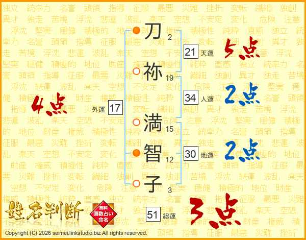 刀(2画)祢(19画) 満(15画)智(12画)子(3画)