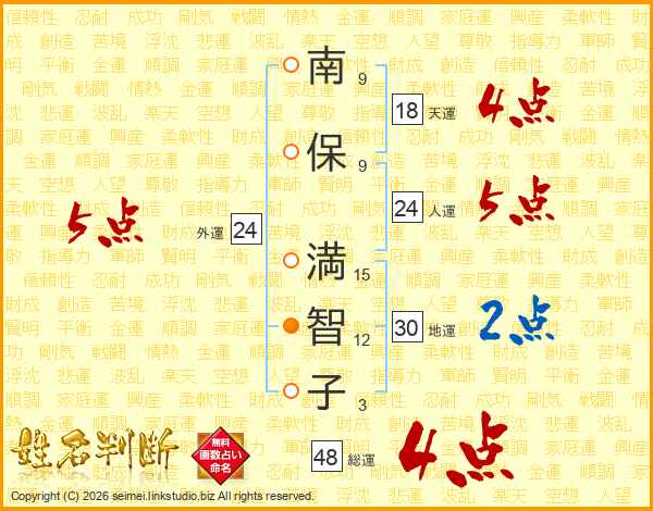 南(9画)保(9画) 満(15画)智(12画)子(3画)
