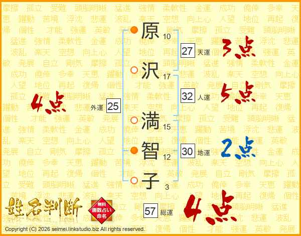 原(10画)沢(17画) 満(15画)智(12画)子(3画)