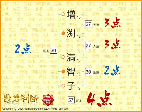 増(15画)渕(12画) 満(15画)智(12画)子(3画)