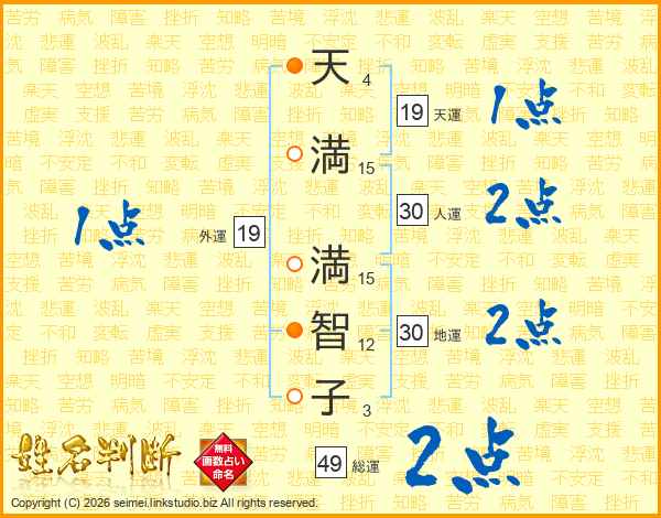 天(4画)満(15画) 満(15画)智(12画)子(3画)