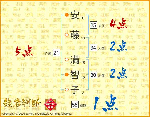 安(6画)藤(19画) 満(15画)智(12画)子(3画)