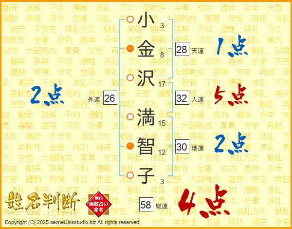 小(3画)金(8画)沢(17画) 満(15画)智(12画)子(3画)