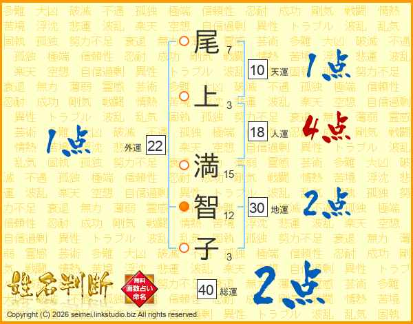 尾(7画)上(3画) 満(15画)智(12画)子(3画)