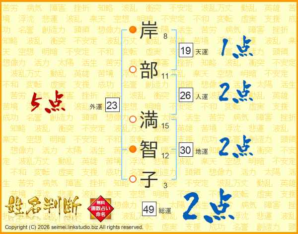岸(8画)部(11画) 満(15画)智(12画)子(3画)