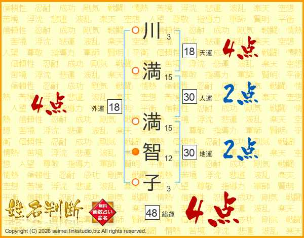 川(3画)満(15画) 満(15画)智(12画)子(3画)