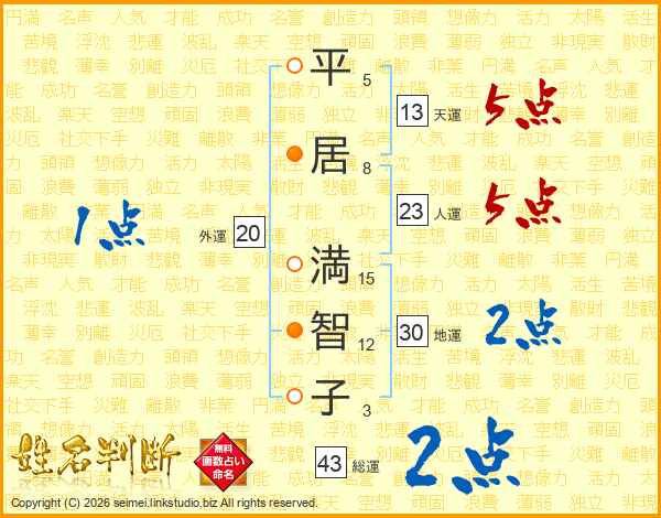 平(5画)居(8画) 満(15画)智(12画)子(3画)