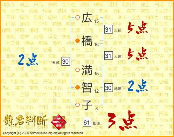 広(15画)橋(16画) 満(15画)智(12画)子(3画)
