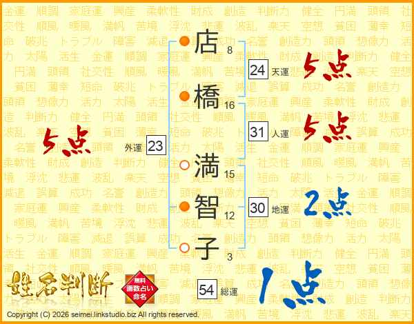 店(8画)橋(16画) 満(15画)智(12画)子(3画)