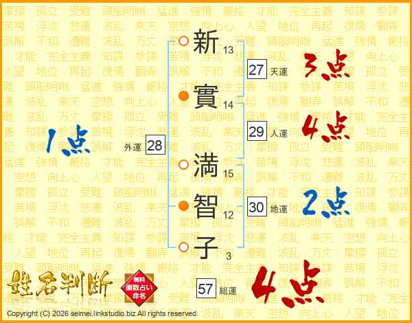 新(13画)實(14画) 満(15画)智(12画)子(3画)