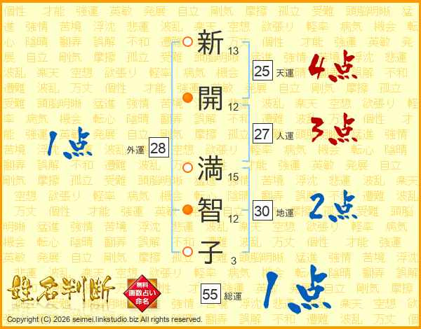 新(13画)開(12画) 満(15画)智(12画)子(3画)