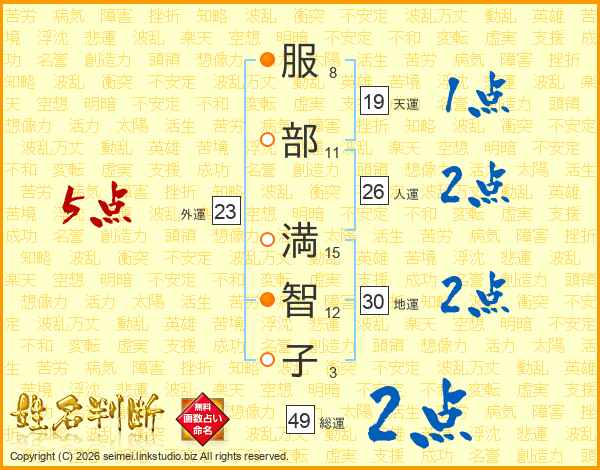 服(8画)部(11画) 満(15画)智(12画)子(3画)