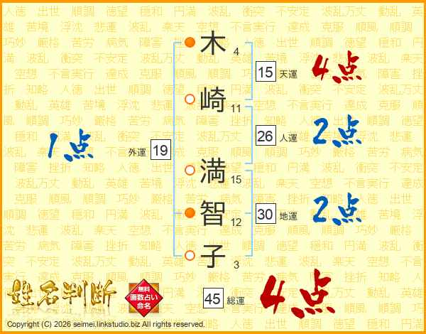 木(4画)崎(11画) 満(15画)智(12画)子(3画)