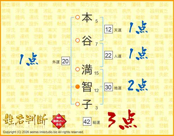 本(5画)谷(7画) 満(15画)智(12画)子(3画)