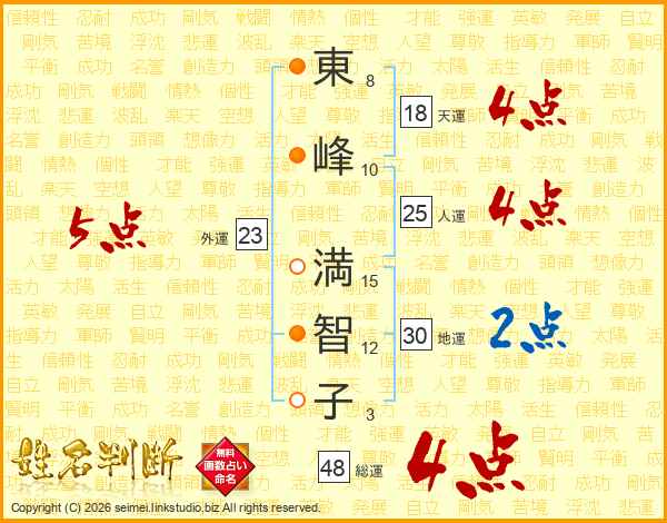 東(8画)峰(10画) 満(15画)智(12画)子(3画)