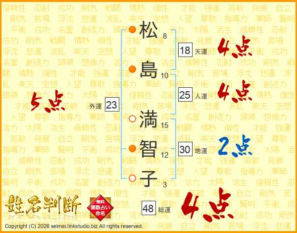 松(8画)島(10画) 満(15画)智(12画)子(3画)