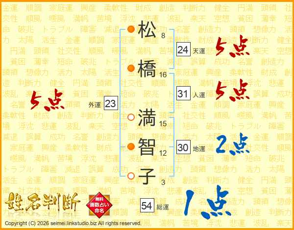 松(8画)橋(16画) 満(15画)智(12画)子(3画)